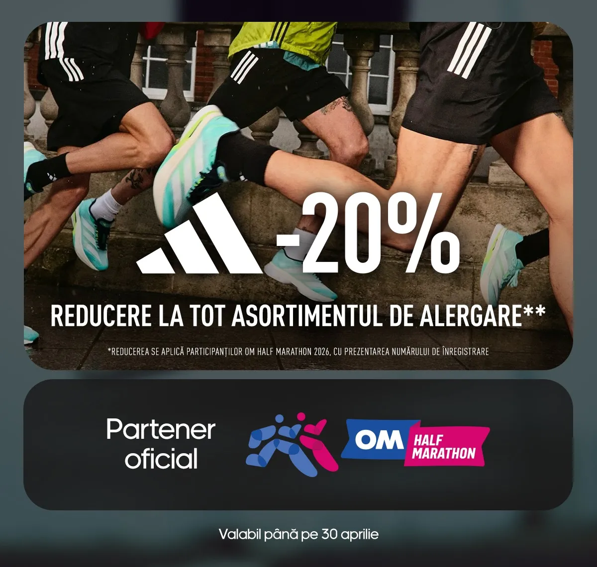 Pentru participanții la maraton este valabilă o ofertă specială: reducere de până la 20% la încălțămintea sport și echipamentul de alergare adidas. Este ocazia perfectă de a te pregăti pentru start cu încălțămintea potrivită — oferind amortizare, susținere a piciorului și confort pe distanță.