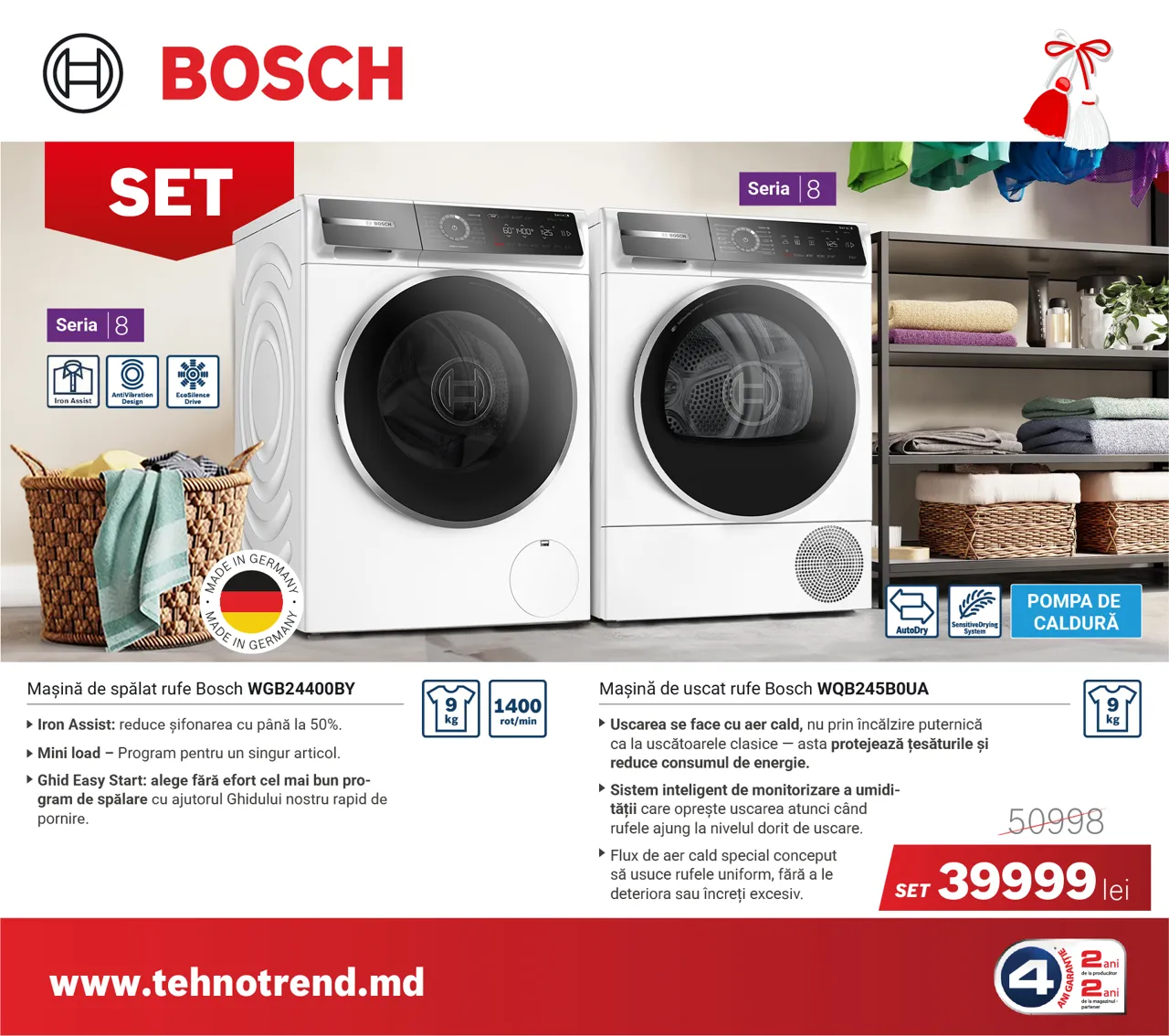 Pentru performanță maximă, setul format din mașina de spălat Bosch WGB24400BY și mașina de uscat Bosch WQB245B0UA oferă o soluție completă pentru îngrijirea hainelor.Doar în luna martie, setul este disponibil cu o reducere impresionantă de 10999 lei.