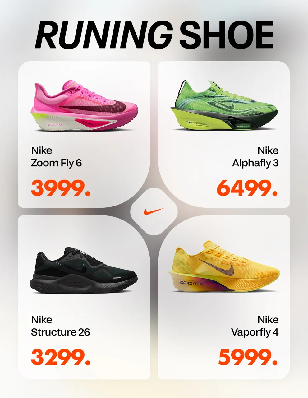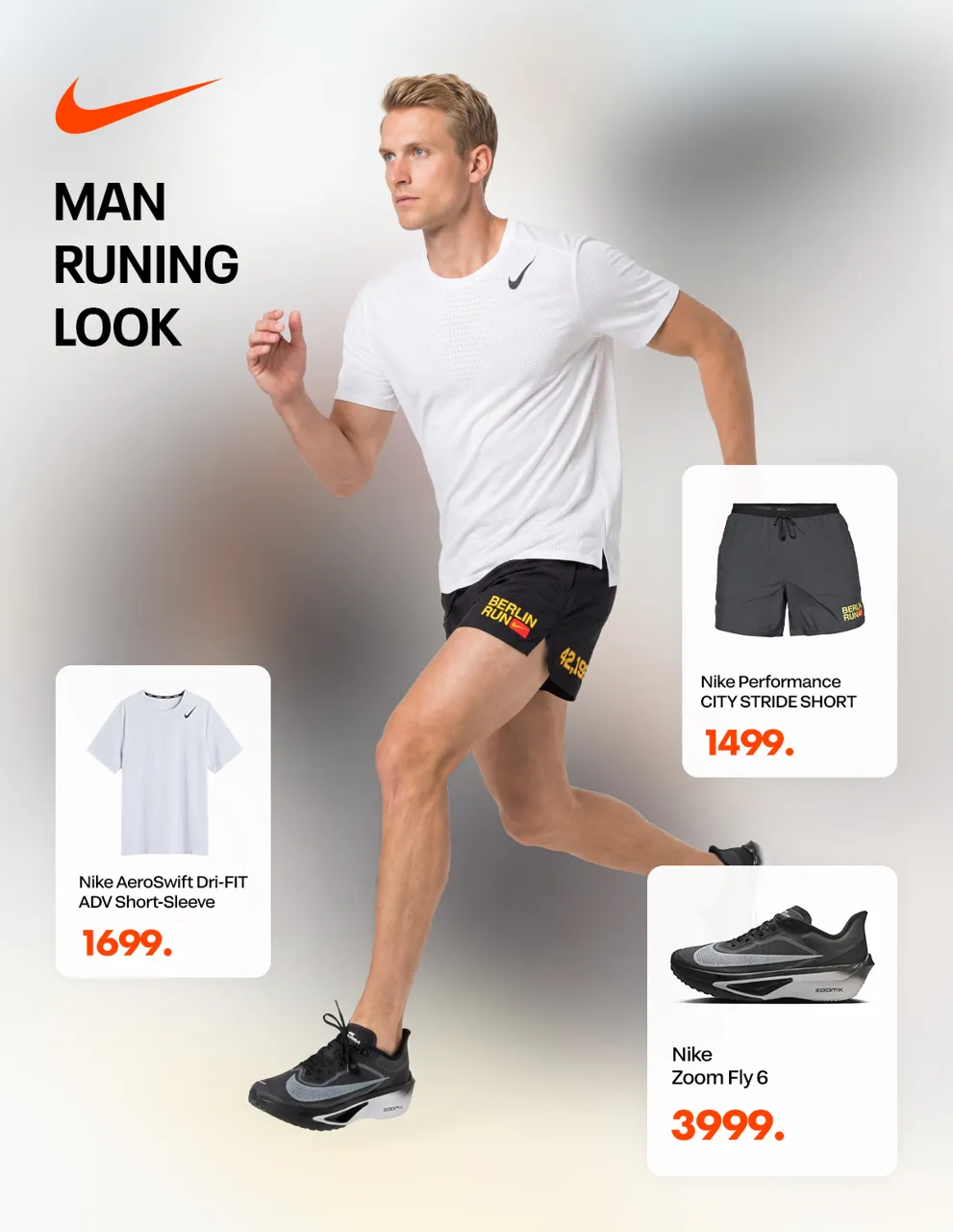 Șorti Nike Performance City Stride cu 1499 lei, tricou Nike AeroSwift Dri-FIT ADV cu 1699 lei și Nike Zoom Fly 6 cu numai 3999 lei.