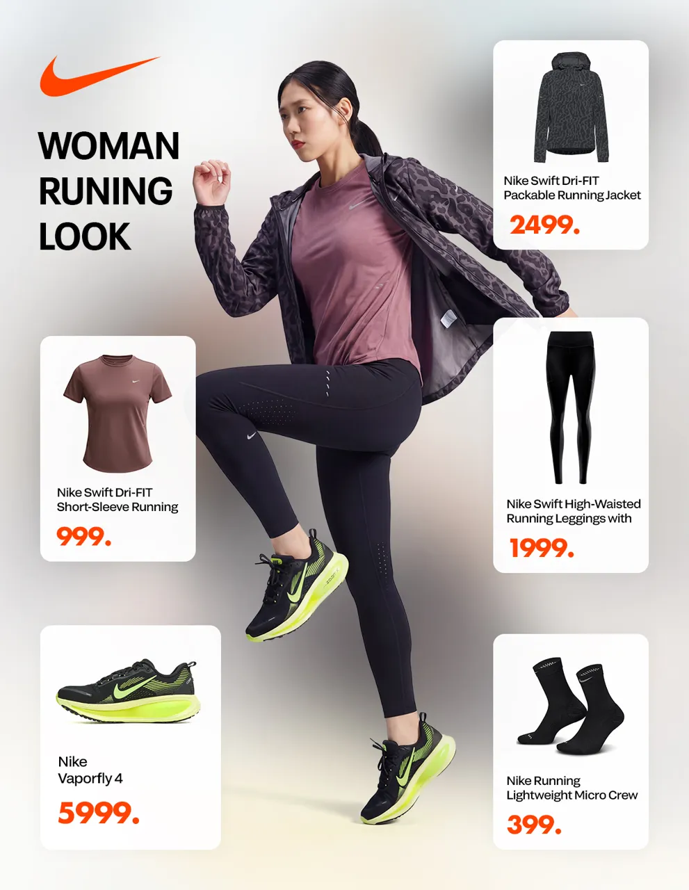 Un outfit bine ales îți oferă încredere la fiecare kilometru. Optează pentru materiale elastice și croieli care susțin corpul fără să limiteze mișcarea. Tricou Nike Swift Dri-FIT cu numai 999 lei, leggings Nike Swift High Waisted cu 1999 lei și Nike Vaporfly 4 la un preț de 5999 lei.