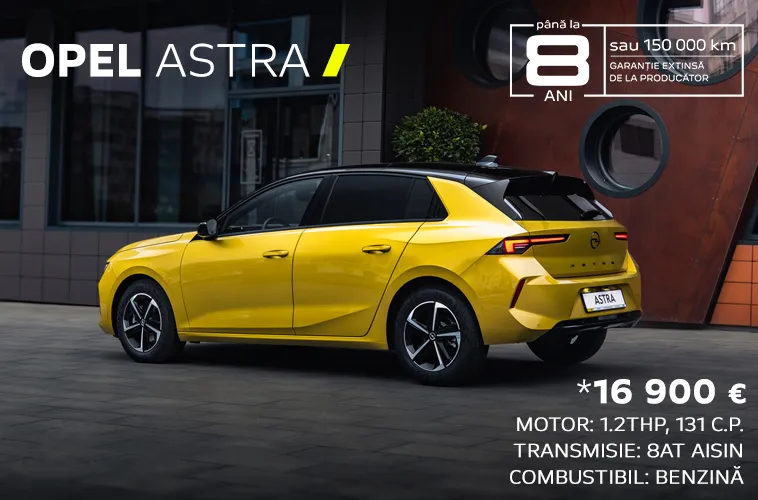Compania GBS anunță lansarea precomenzilor pentru hatchback-ul OPEL Astra la prețul de 16 900 euro. Este vorba despre versiunea cu motor pe benzină 1.2 THP de 131 CP și cutie de viteze automată Aisin cu 8 trepte.