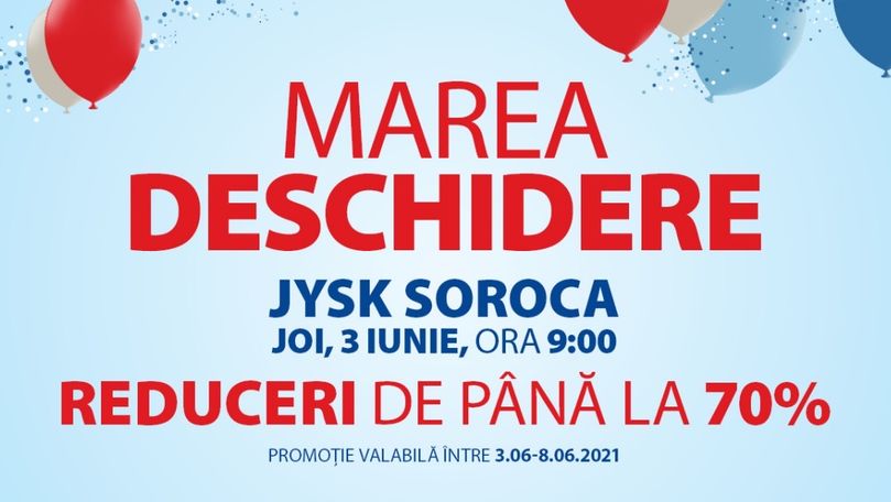 JYSK anunță deschiderea, pe 3 iunie, a celui de al 8-lea magazin al rețelei din Republica Moldova. Astfel, mărfurile vor putea fi găsite și în orașul Soroca pe strada Ștefan cel Mare, 110, lângă supermarketul Fourchette.