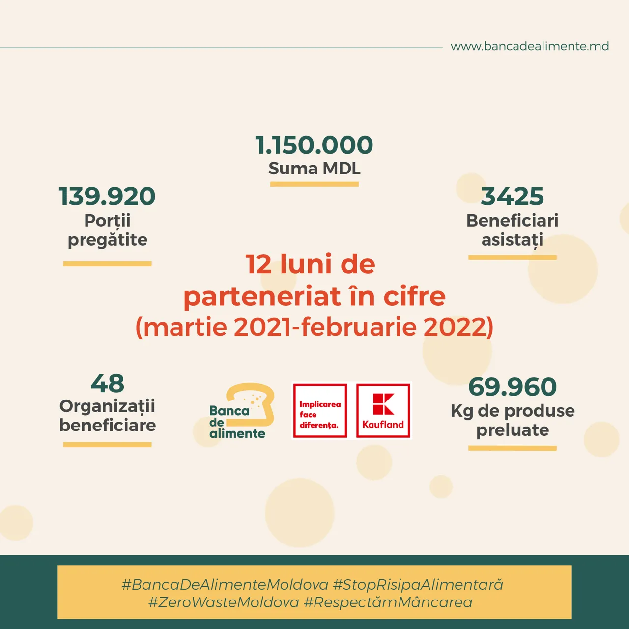În acest fel, peste 70 de tone de produse, în valoare de circa 1,2 milioane lei, au fost recuperate din rețeaua de magazine Kaufland. Produsele alimentare sub formă de 140,000 de porții de mâncare caldă au ajuns la peste 3,500 de beneficiari, prin intermediul a 48 de organizații nonguvernamentale.