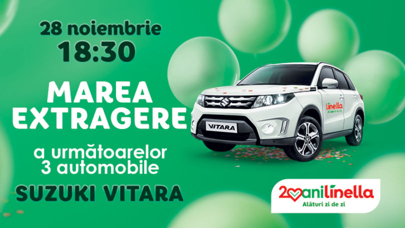 Amintim că în acestă duminică, 28 noiembrie, rețeaua de magazine Linella organizează cea de-a două extragere, pentru următoarele 3 automobile Suzuki Vitara, începând cu ora 18:30, în direct la postul de televiziune Prime TV, cât și pe pagina oficială de Facebook și youtube Linella.