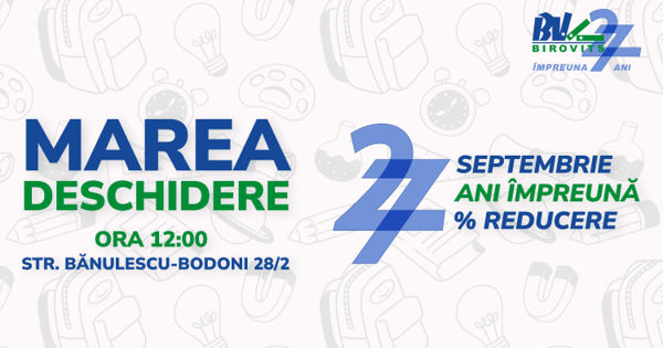Pe 27 septembrie, ora 12:00, pe str. Bănulescu-Bodoni 28/2 își deschide ușile noul Magazin - workshop Birovits. Vizitatorii vor primi cadouri, premii și reduceri de 27% la articole de birou și accesorii.