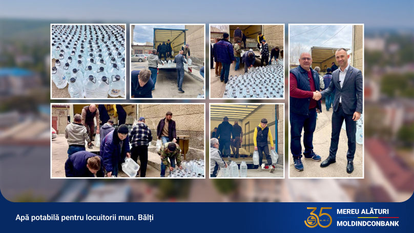 Comitetul de Conducere al băncii a decis donarea a 2.777 de butelii de apă potabilă, a câte 6 litri fiecare, pentru locuitorii municipiului Bălți, unde aprovizionarea cu apă din această sursă a fost sistată. Apa a fost deja transmisă autorităților publice locale, pentru a fi distribuită către populație.