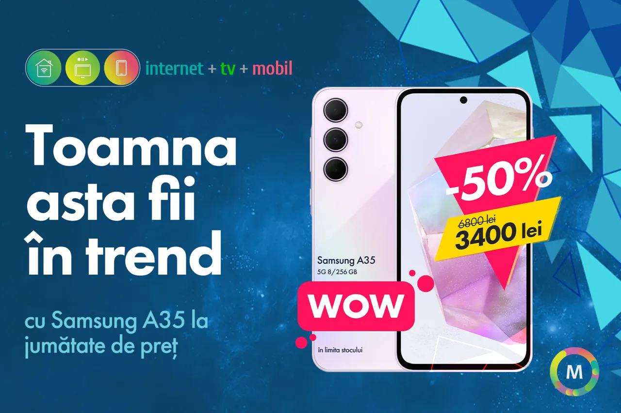 Cumpără noul Samsung A35 la un preț special de 3.400 de lei. Îți oferim reducere de până la 50%, în funcție de numărul de servicii contractate. Beneficiezi de 20% reducere la smartphone dacă optezi pentru un abonament de telefonie mobilă începând cu Smart 55; 35% reducere - adăugând și un abonament de Internet fix sau 50% reducere - completând cu un abonament de Televiziune. Astfel, ai toate serviciile de la un singur operator, în calitate premium și cu economii semnificative.