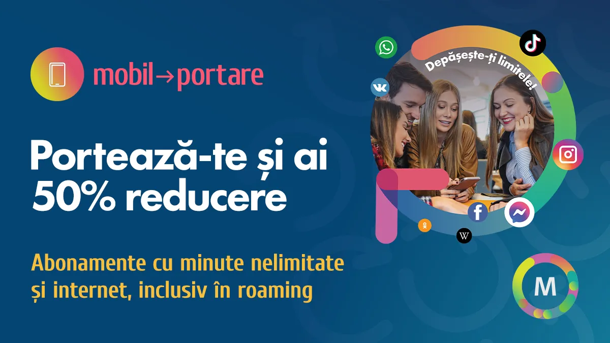 Ce-ar fi să plătești doar 50% pentru un abonament de telefonie mobilă care îți oferă tot ce ai nevoie? Simplu: treci la Moldtelecom, păstrează-ți numărul tău de telefon și bucură-te de minute naționale nelimitate, până la 245 GB Internet, minute internaționale pentru a rămâne conectat cu cei dragi din străinătate și roaming pentru călătorii fără griji.