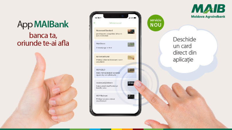 Începând cu 18 noiembrie 2020, clienţii MAIB au posibilitatea de a depune cererea şi semna contractul de emitere a cardurilor sistemelor internaţionale de plăţi Visa, Mastercard si AMEX direct din aplicaţia MAIBank.