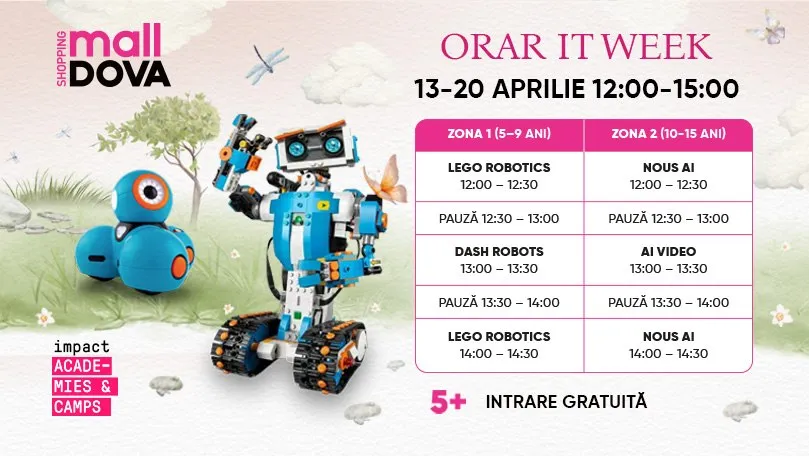 În perioada 13–20 aprilie, între orele 12:00 și 15:00, Shopping MallDova găzduiește IT Week – o serie de activități gratuite pentru copii și adolescenți. Participanții vor descoperi lumea tehnologiei prin workshop-uri interactive și sesiuni educative captivante, combinând distracția cu învățarea.