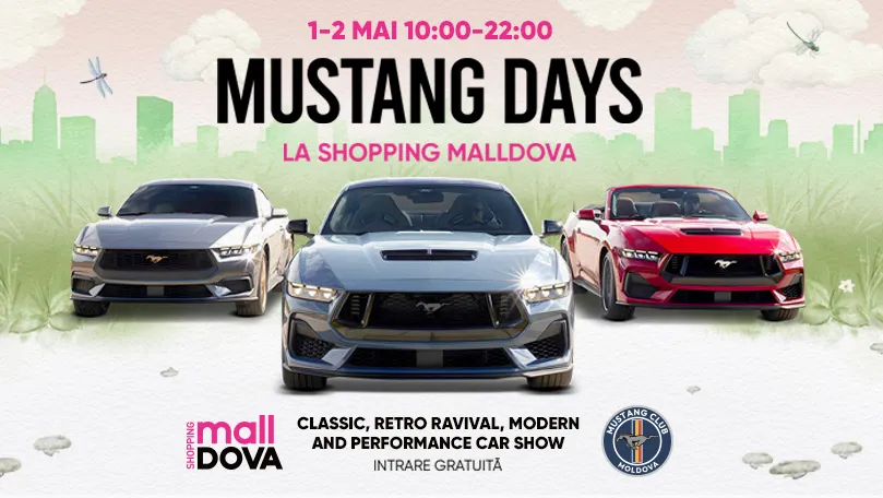 La începutul lunii mai, vă invităm la Mustang Days — pe 1 și 2 mai, între orele 10:00 și 22:00. Peste 40 de automobile impresionante, de la modele clasice și retro până la versiuni moderne high-performance, vor crea o atmosferă pe care o vor aprecia cu adevărat toți pasionații de cultură auto.