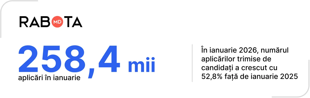 Utilizatorii Rabota.md au trimis 258,4 mii de CV-uri – acesta fiind un maxim absolut din toată perioada de activitate a platformei și cu 52,8% mai mult decât în ianuarie anul trecut.