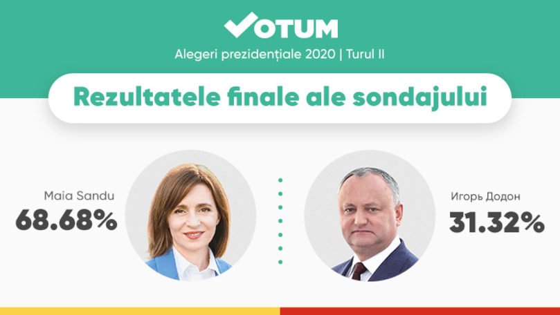 Rezultate finale Votum.md: Maia Sandu - 68,68%, iar Igor Dodon - 31,32%