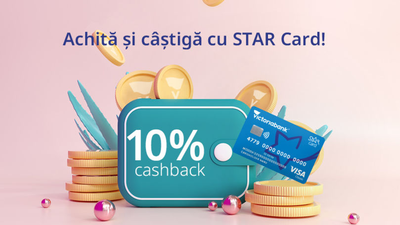 Victoriabank lansează astăzi campania promoțională „Achită și câștigă cu STAR Card”, care se va desfășura între 15 iulie și 15 septembrie 2021. Timp de două luni, deținătorii de STAR Card, care achită în rate la oricare dintre partenerii STAR, vor primi 10% cashback pentru cumpărăturile efectuate în rate de minimum 500 de lei.