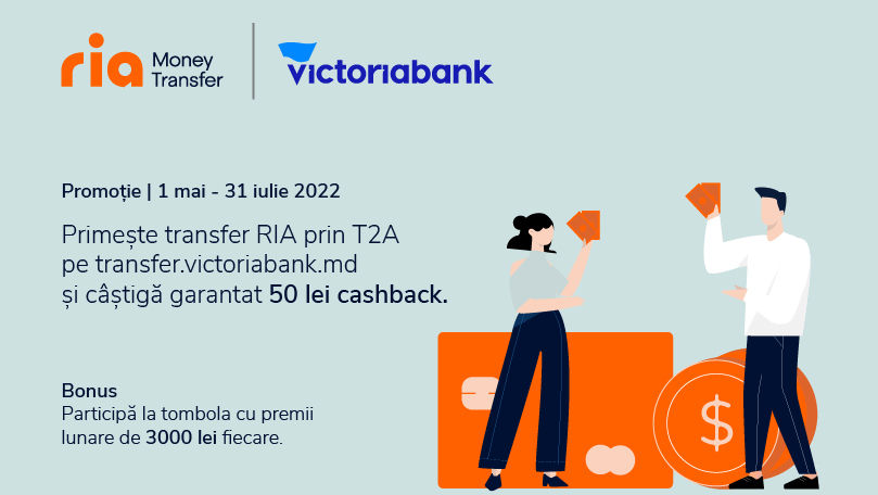 În perioada 1 mai – 31 iulie 2022, transferurile cu Ria primite în contul curent sau pe card, în valoare de minim 3500 de lei, prin platforma de transfer online de la Victoriabank, T2A, îți aduc garantat 50 de lei.