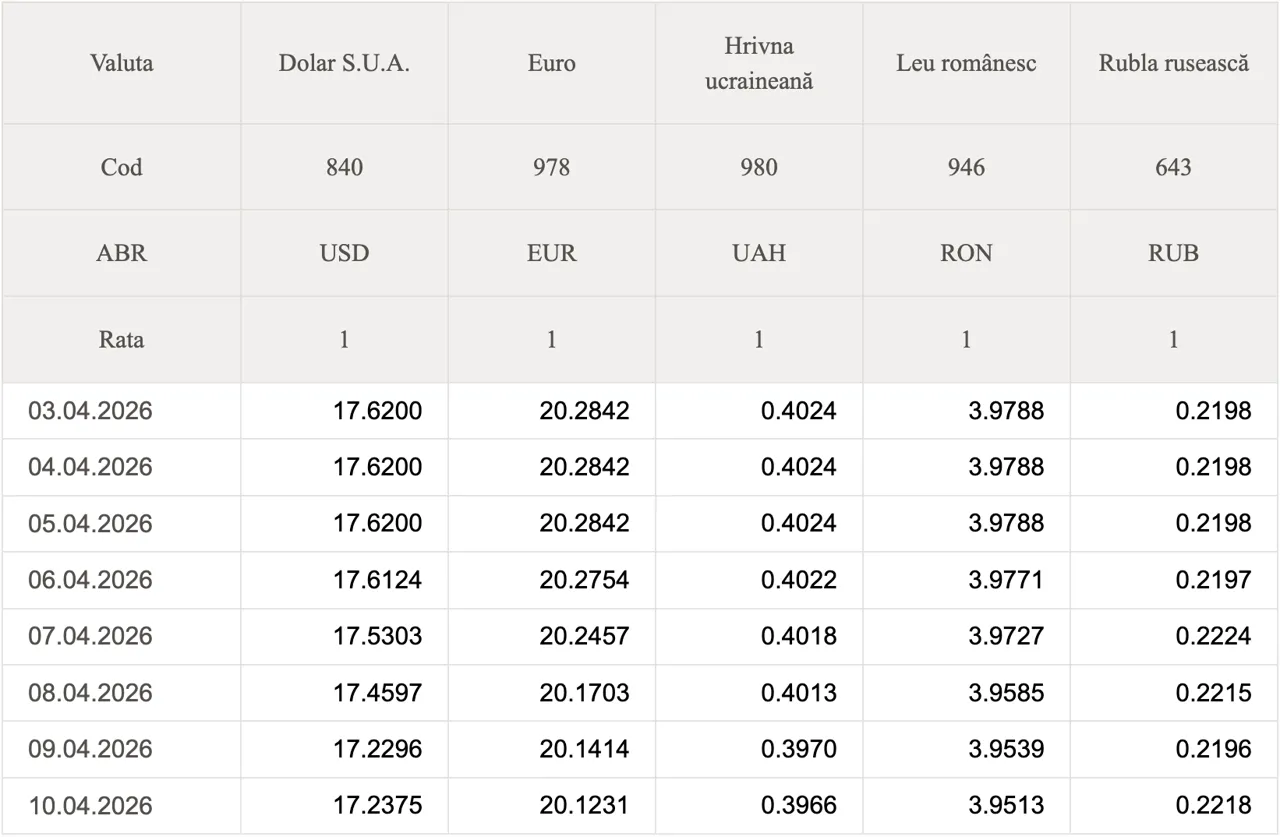 Banca Națională a Moldovei (BNM) a stabilit datele oficiale de schimb valutar pentru astăzi.