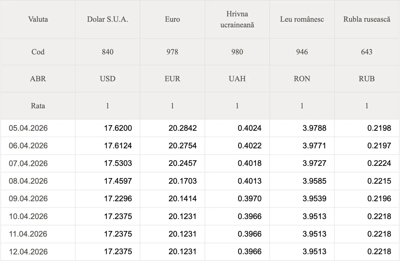Banca Națională a Moldovei (BNM) a stabilit datele oficiale de schimb valutar pentru astăzi.