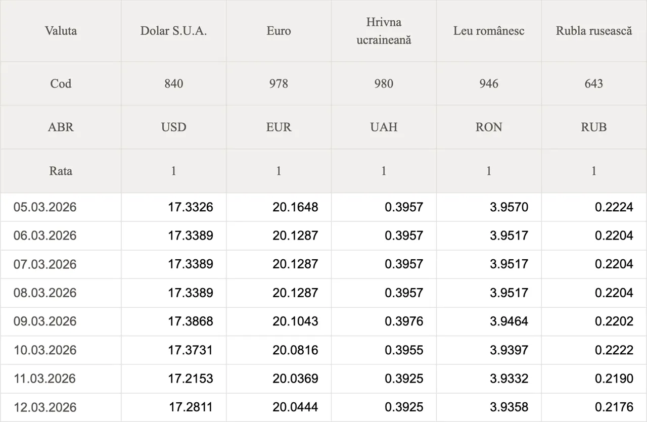 Banca Națională a Moldovei (BNM) a stabilit datele oficiale de schimb valutar pentru astăzi.