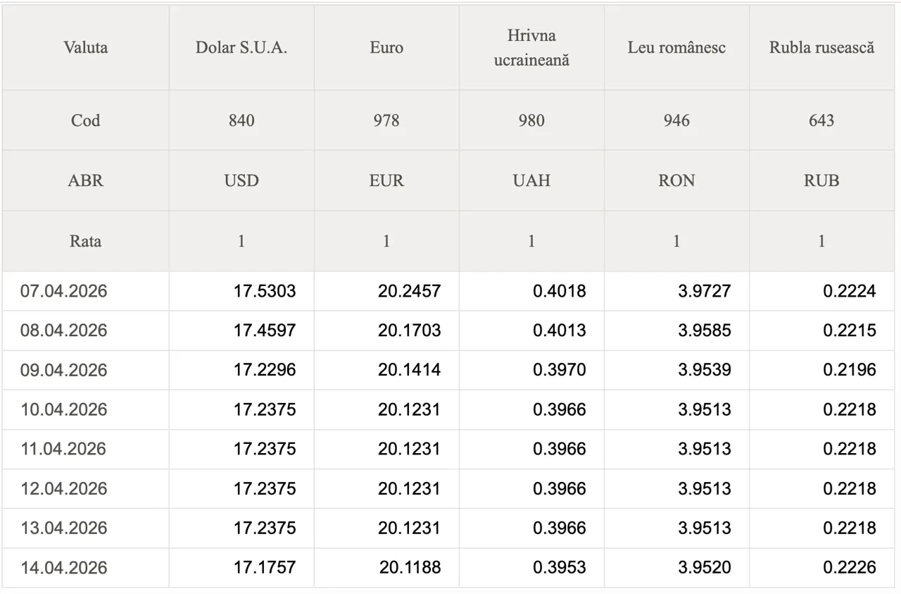 Banca Națională a Moldovei (BNM) a stabilit datele oficiale de schimb valutar pentru astăzi.