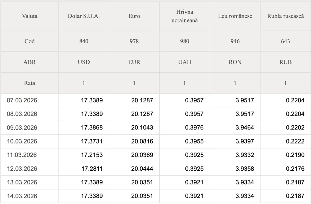 Banca Națională a Moldovei (BNM) a stabilit datele oficiale de schimb valutar pentru astăzi, 14 martie.