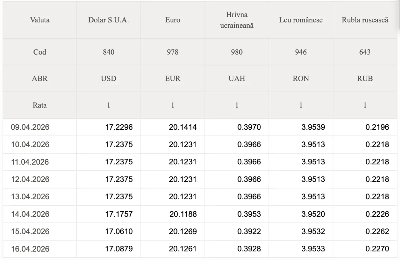 Banca Națională a Moldovei (BNM) a stabilit datele oficiale de schimb valutar pentru astăzi.