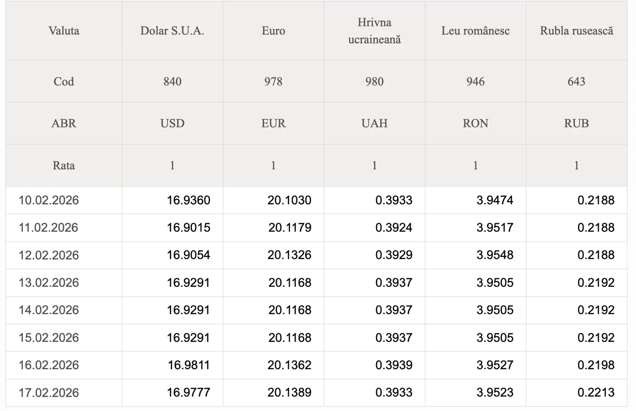Banca Națională a Moldovei (BNM) a stabilit datele oficiale de schimb valutar pentru astăzi, 17 februarie.