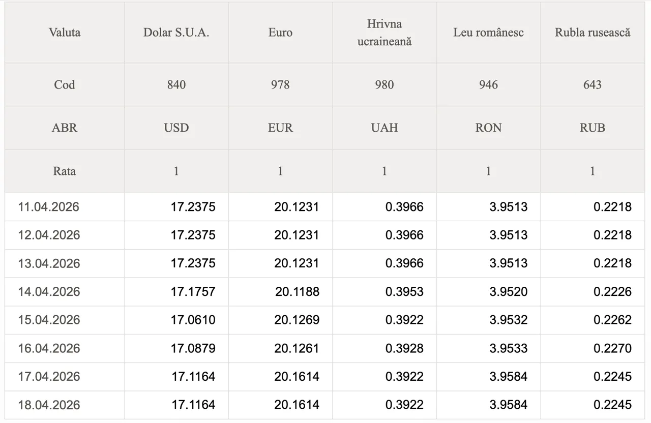 Banca Națională a Moldovei (BNM) a stabilit datele oficiale de schimb valutar pentru astăzi, 18 aprilie 2026.