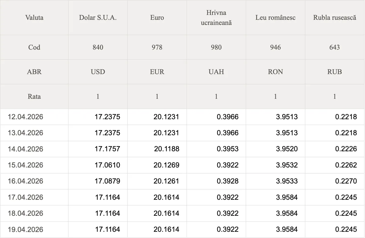 Banca Națională a Moldovei (BNM) a stabilit datele oficiale de schimb valutar pentru astăzi.