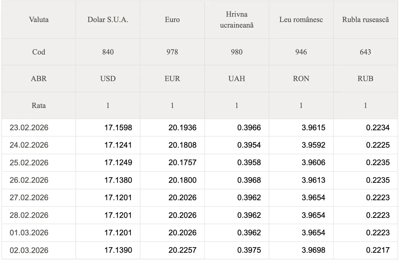 Banca Națională a Moldovei (BNM) a stabilit datele oficiale de schimb valutar pentru astăzi.