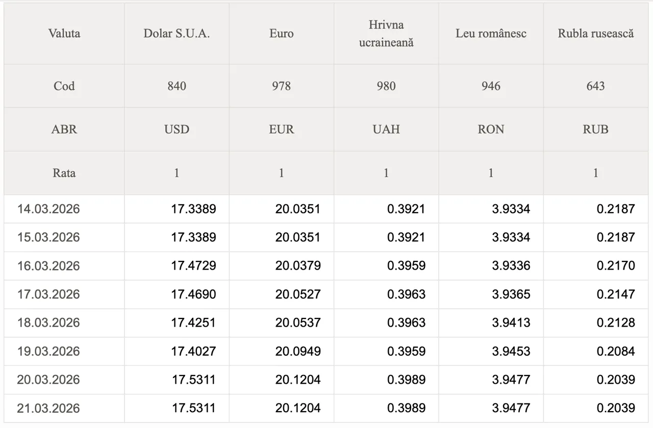 Banca Națională a Moldovei (BNM) a stabilit datele oficiale de schimb valutar pentru astăzi, 21 martie.