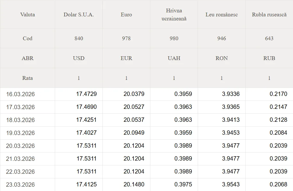 Banca Națională a Moldovei (BNM) a stabilit datele oficiale de schimb valutar pentru astăzi.
