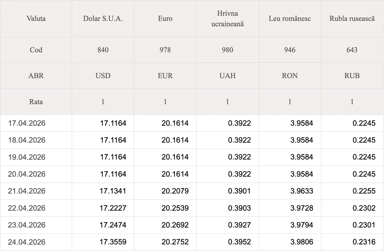 Banca Națională a Moldovei (BNM) a stabilit datele oficiale de schimb valutar pentru astăzi.