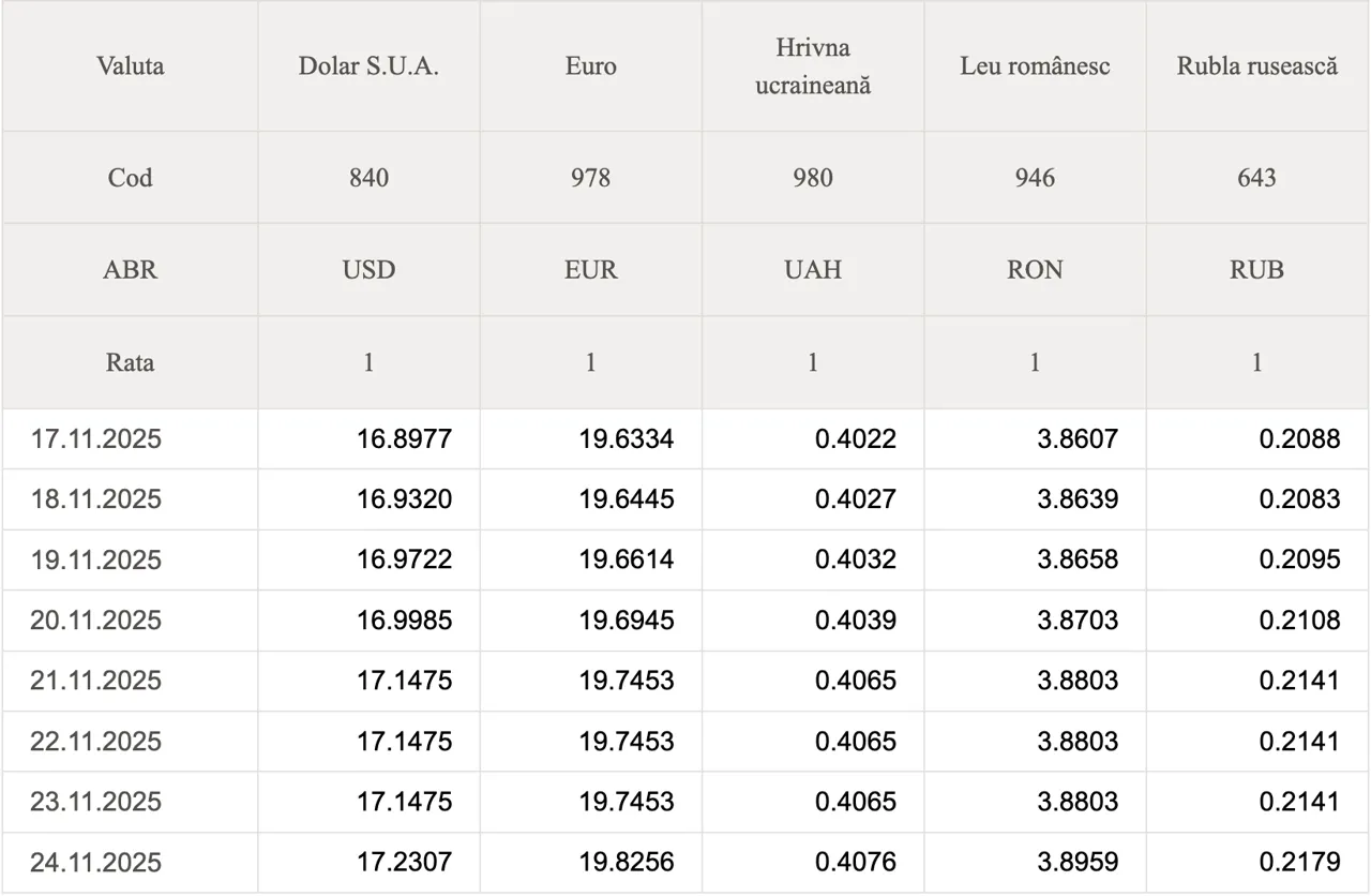 Banca Națională a Moldovei (BNM) a stabilit datele oficiale de schimb valutar pentru ziua de astăzi, 24 noiembrie 2025.