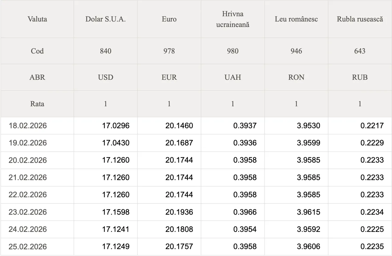 Curs valutar 25 februarie 2026: Cât valorează un euro și un dolar