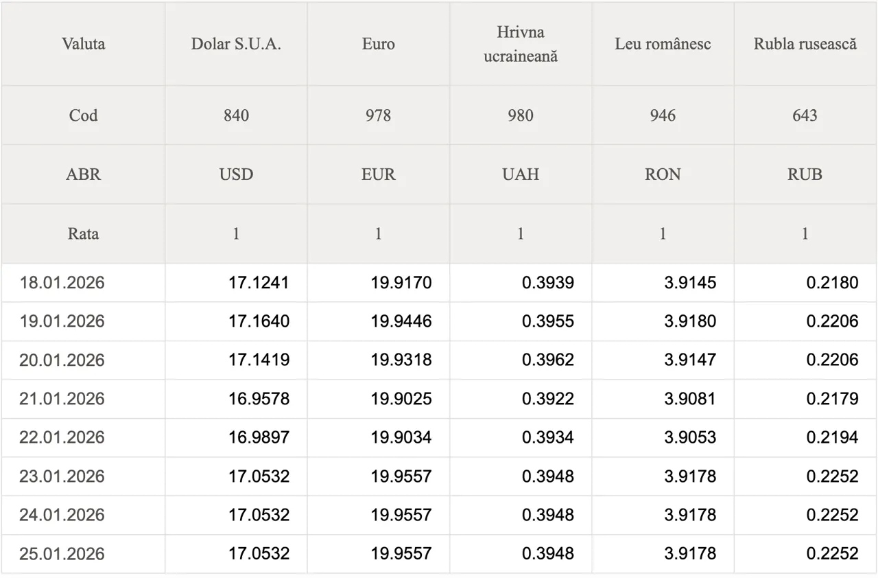 Banca Națională a Moldovei (BNM) a stabilit datele oficiale de schimb valutar pentru ziua de astăzi, 25 ianuarie 2026.