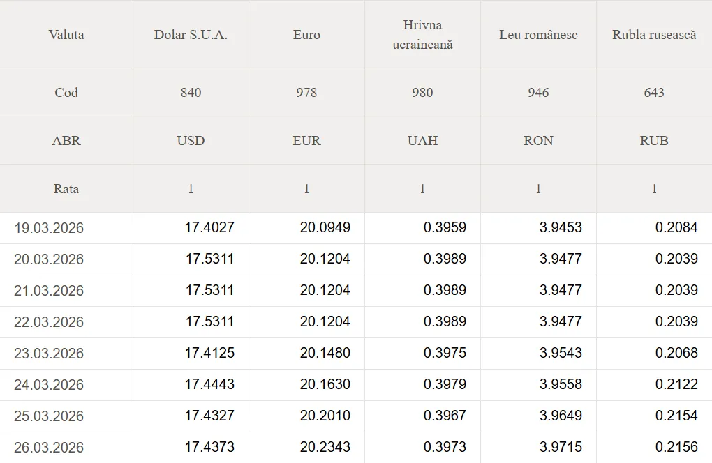 Banca Națională a Moldovei (BNM) a stabilit datele oficiale de schimb valutar pentru astăzi.
