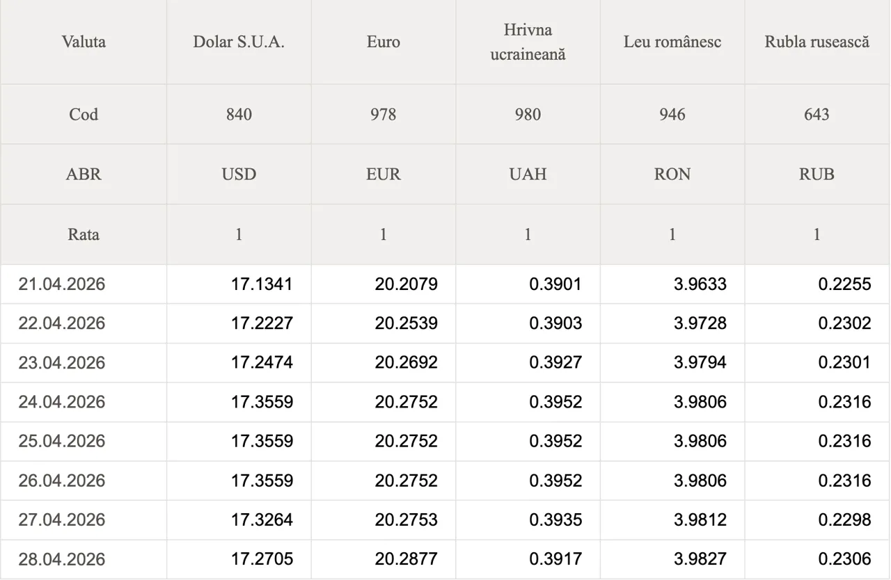 Banca Națională a Moldovei (BNM) a stabilit datele oficiale de schimb valutar pentru astăzi.