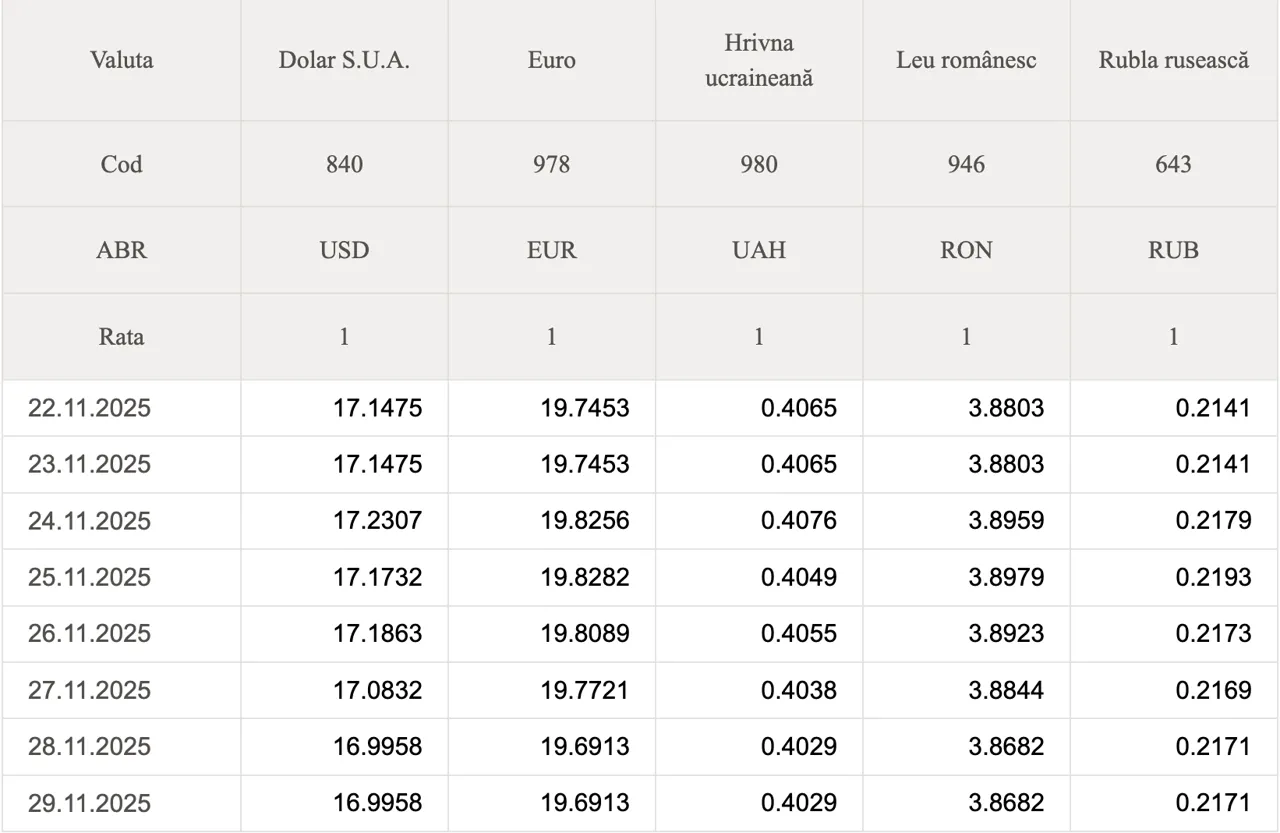Banca Națională a Moldovei (BNM) a stabilit datele oficiale de schimb valutar pentru ziua de astăzi, 29 noiembrie 2025.