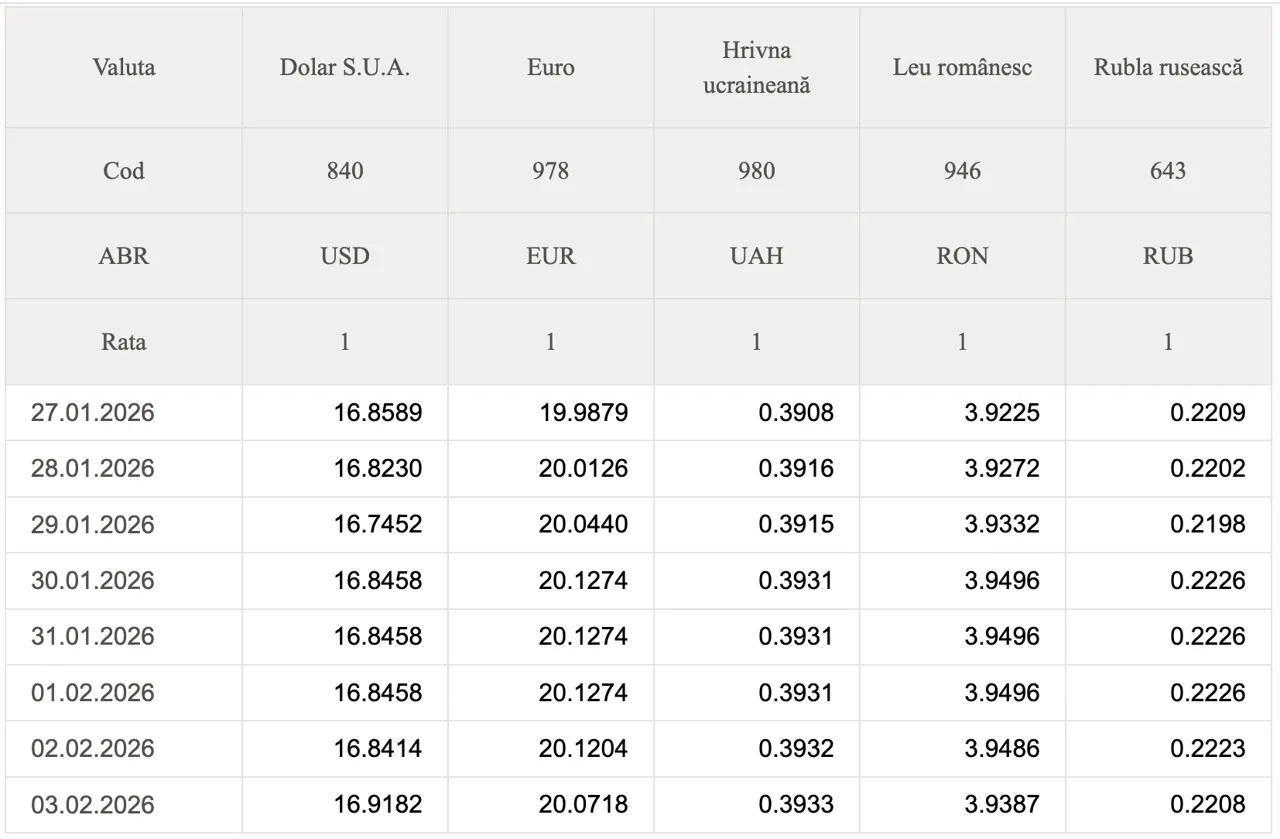 Banca Națională a Moldovei (BNM) a stabilit datele oficiale de schimb valutar pentru astăzi, 3 februarie 2026.
