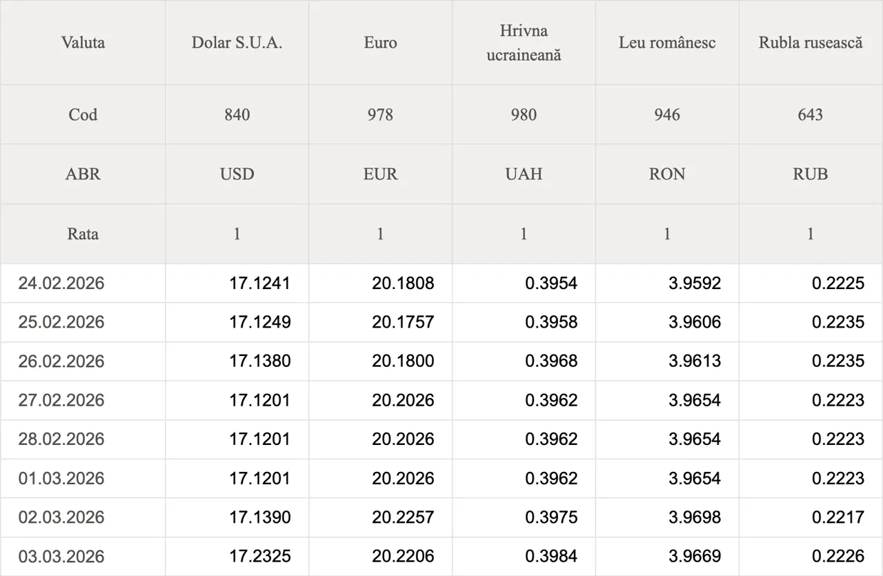 Banca Națională a Moldovei (BNM) a stabilit datele oficiale de schimb valutar pentru astăzi.