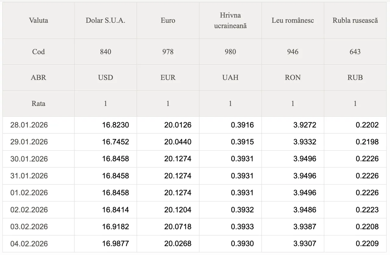 Banca Națională a Moldovei (BNM) a stabilit datele oficiale de schimb valutar pentru astăzi, 4 februarie 2026.