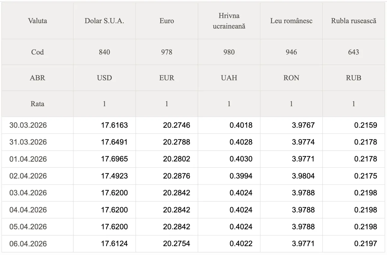 Banca Națională a Moldovei (BNM) a stabilit datele oficiale de schimb valutar pentru astăzi.