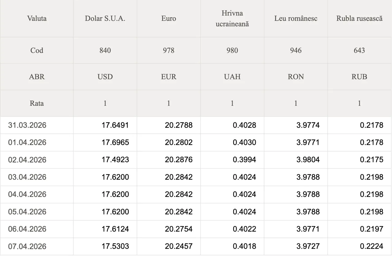 Banca Națională a Moldovei (BNM) a stabilit datele oficiale de schimb valutar pentru astăzi.