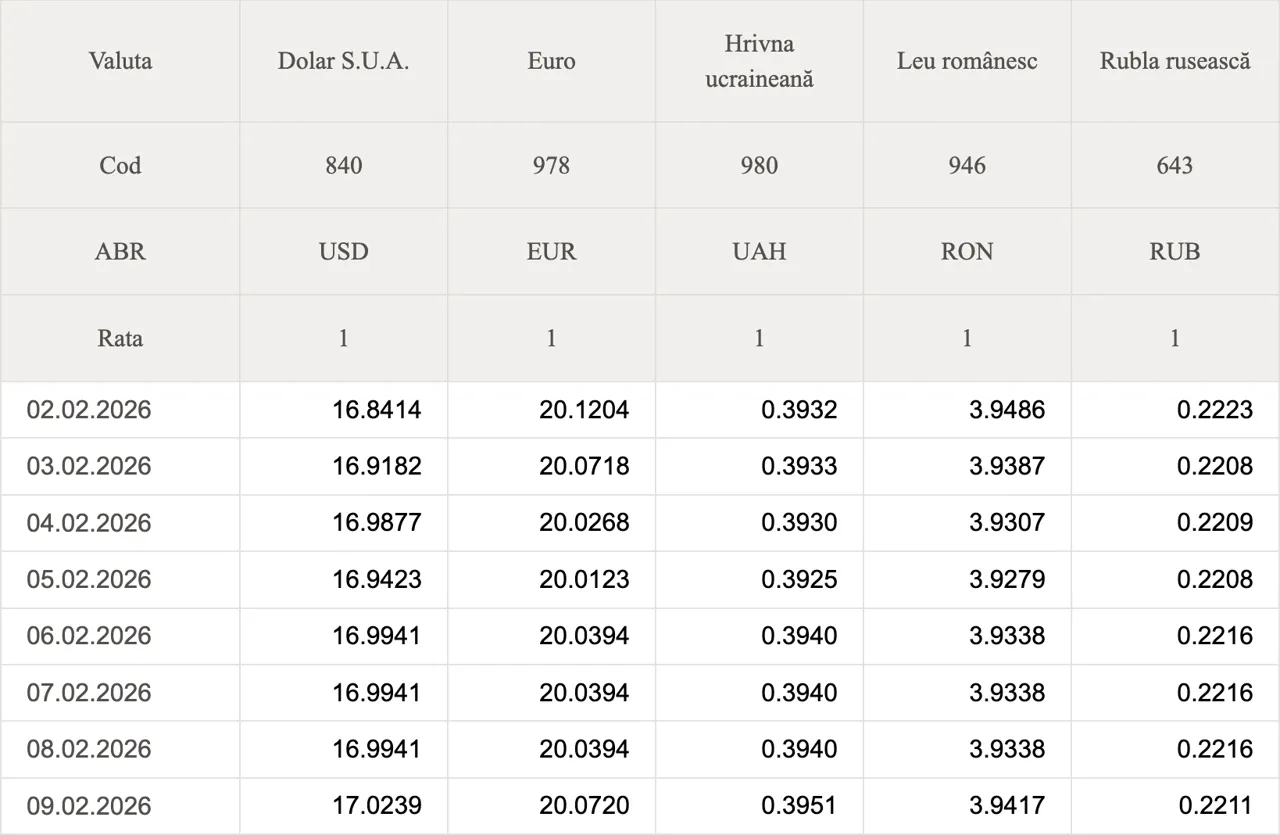 Banca Națională a Moldovei (BNM) a stabilit datele oficiale de schimb valutar pentru astăzi.