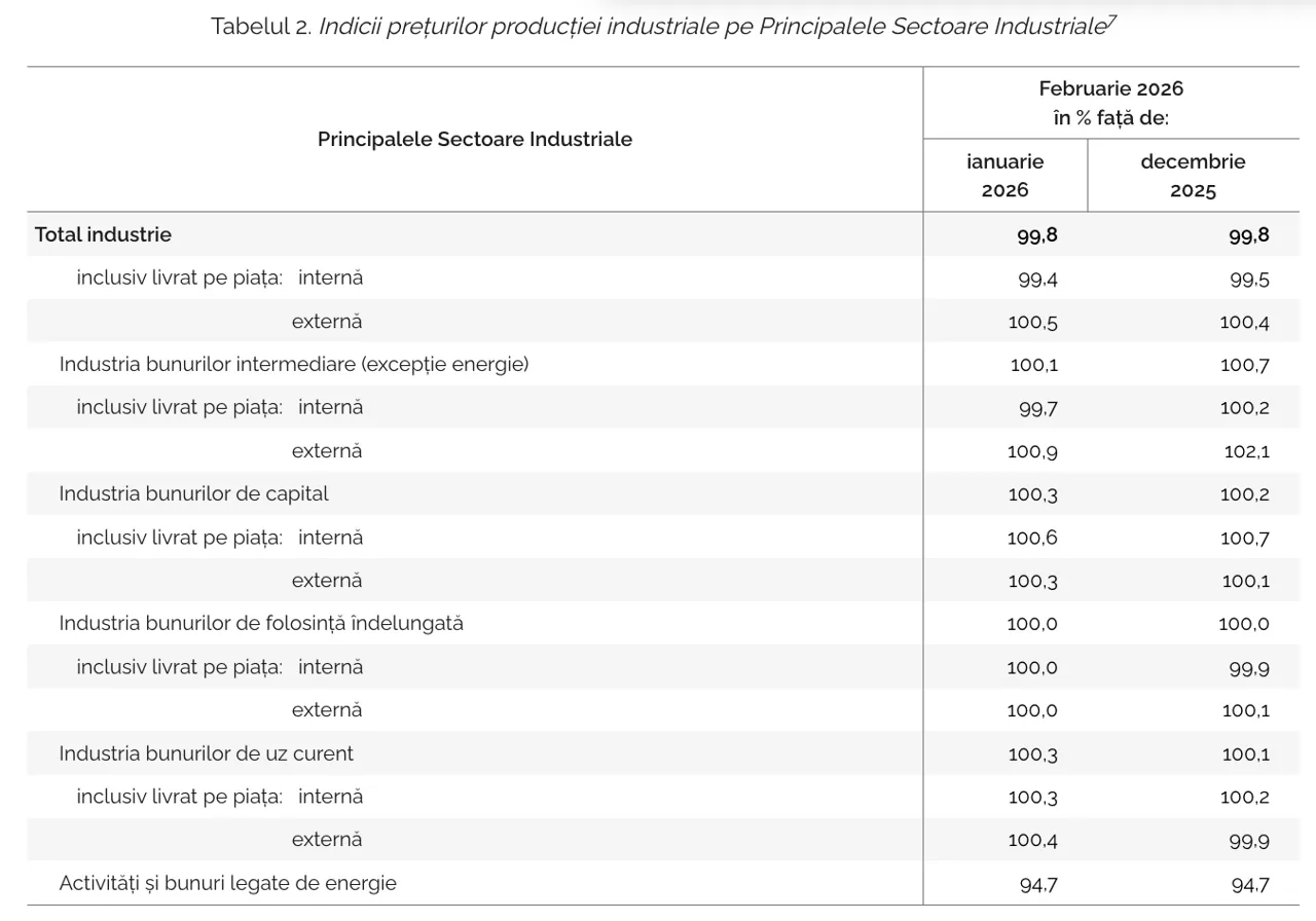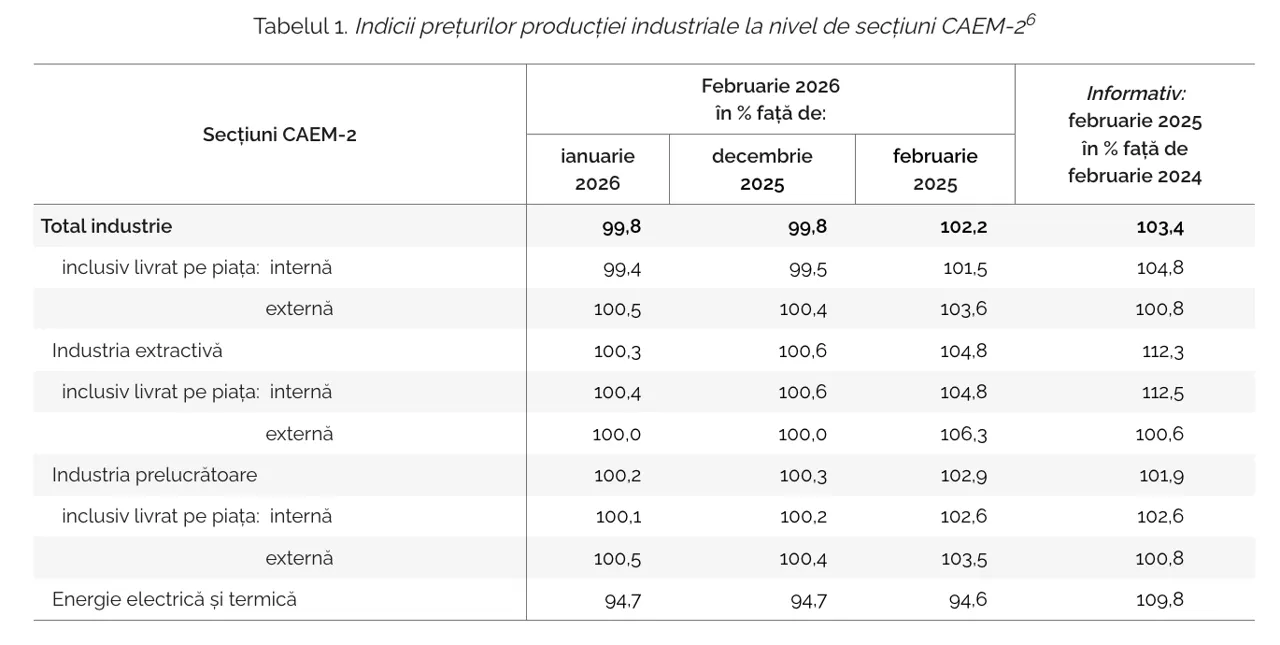 În schimb, sectorul energetic a tras în jos media generală: aici, prețurile producătorului au scăzut cu 5,3% față de ianuarie, cu același procent față de decembrie 2025 și cu 5,4% comparativ cu februarie 2025.