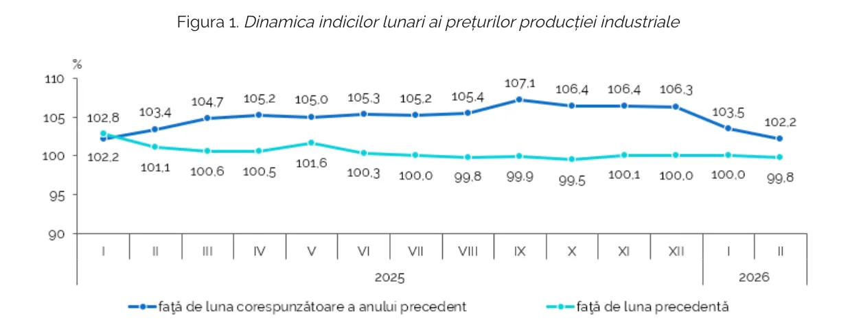 Biroul Național de Statistică (BNS) anunță că, în luna februarie, prețurile producătorului în industrie din Republica Moldova au înregistrat o scădere de 0,2% față de luna ianuarie curent. Aceeași diminuare, de 0,2%, este consemnată și de la începutul anului. În același timp, comparativ cu februarie 2025, prețurile au crescut cu 2,2%.