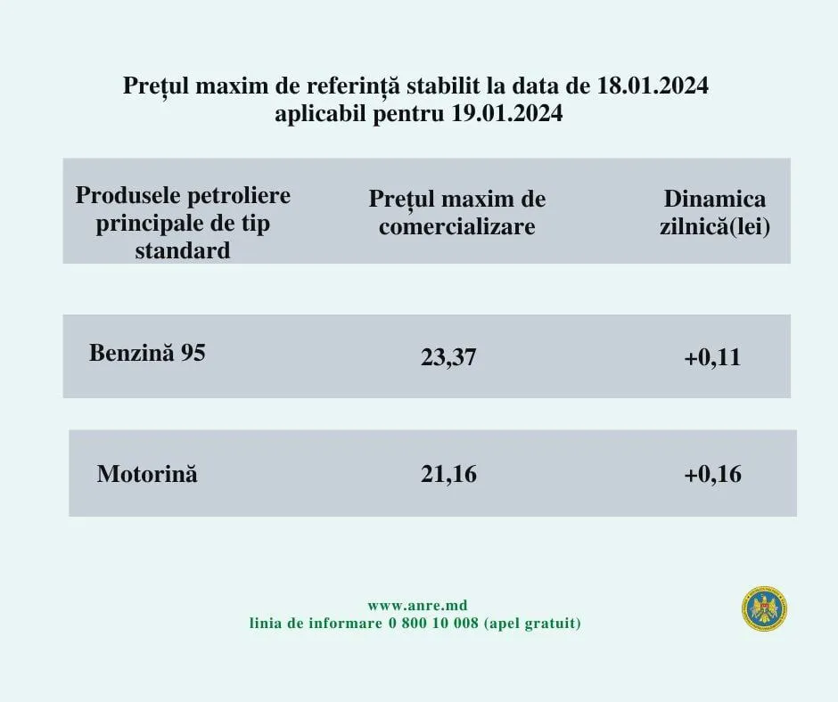 Agenția Națională pentru Reglementare în Energetică (ANRE) a stabilit prețurile maxime de referință pentru produsele petroliere principale de tip standard pentru mâine, 19 ianuarie.