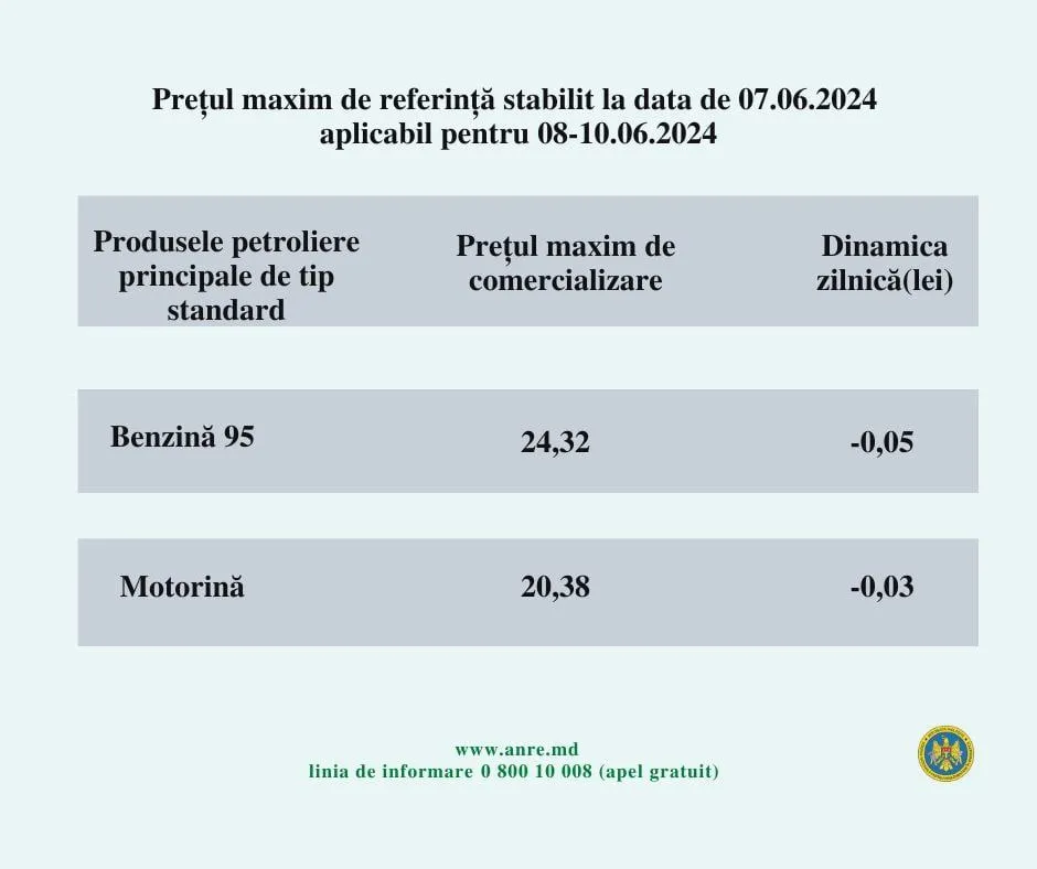 Agenția Națională pentru Reglementare în Energetică (ANRE) a stabilit prețurile maxime de referință pentru produsele petroliere principale de tip standard pentru perioada 8-10 iunie.