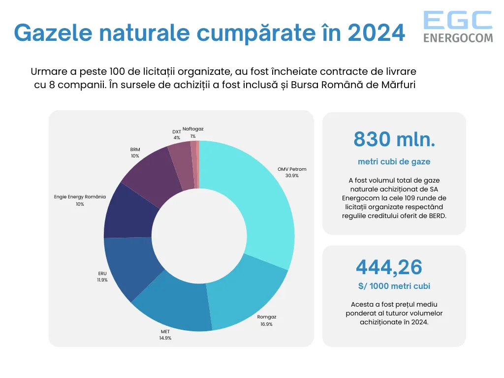 Energocom a cumpărat, în perioada aprilie-decembrie 2024, peste 8,8 milioane MWh de gaze naturale (echivalentul a 830 milioane metri cubi) cu prețul mediu ponderat de 40,09 euro/MWh (sau circa 444,26 dolari SUA/ 1.000 metri cubi).
