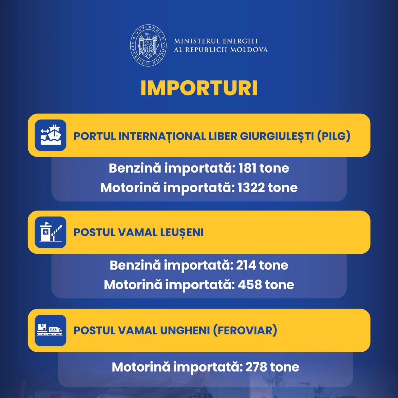 Imagine simbolMai exact, pe parcursul zilei de ieri, 23 martie, au fost importate aproape 2.060 de tone de motorină și 400 de tone de benzină atât prin Portul Internațional Liber Giurgiulești, cât și cu transport auto și feroviar, transmite Știri.md.